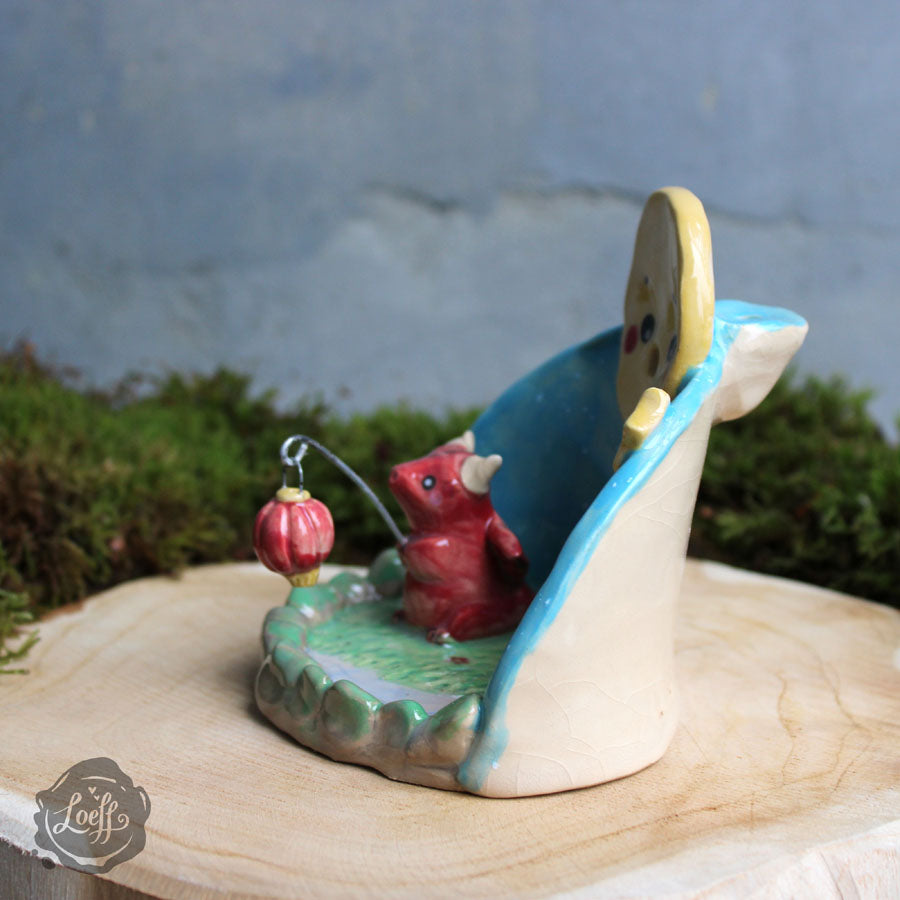 De Back-flow Wierookhouder is een klein kunstwerk met een aromatisch doel. Elke wierookhouder wordt individueel gemodelleerd rond een uniek thema en na het bakken in de oven met de hand beschilderd met glazuren. Na de laatste stook komen de levendige kleuren en fijne details tot leven, precies zoals op de foto’s te zien.