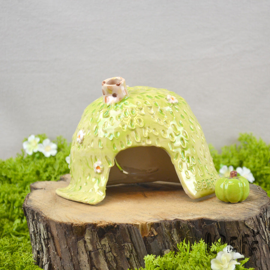 Een wierookkegel kan worden geplaatst op een klein schaaltje binnenin de brander. Wanneer je deze aansteekt, stroomt de geurige rook zachtjes door de schoorsteen naar buiten, wat zorgt voor een rustgevend en bijna magisch effect. Natuurlijk is deze charmante Meadow Home ook geschikt voor waxinelichtjes.